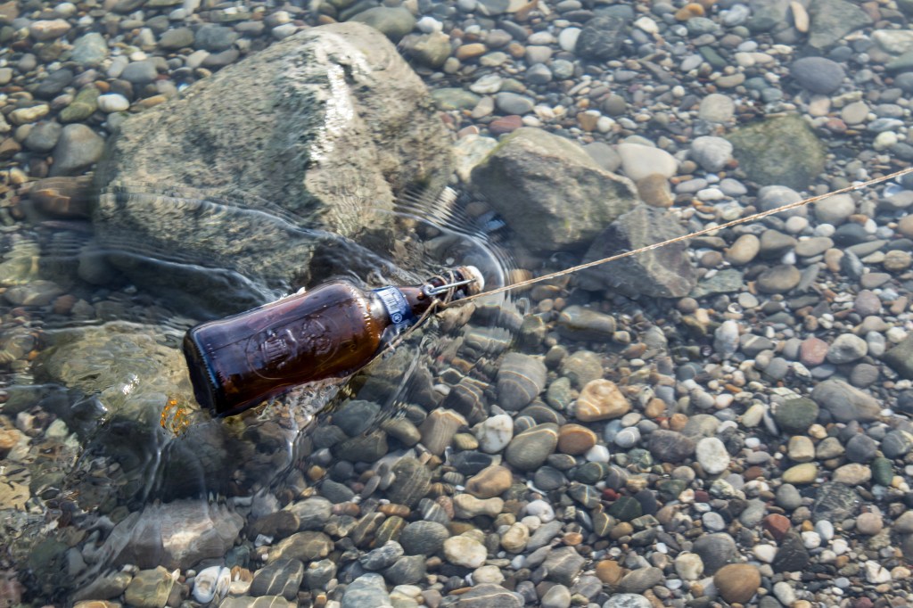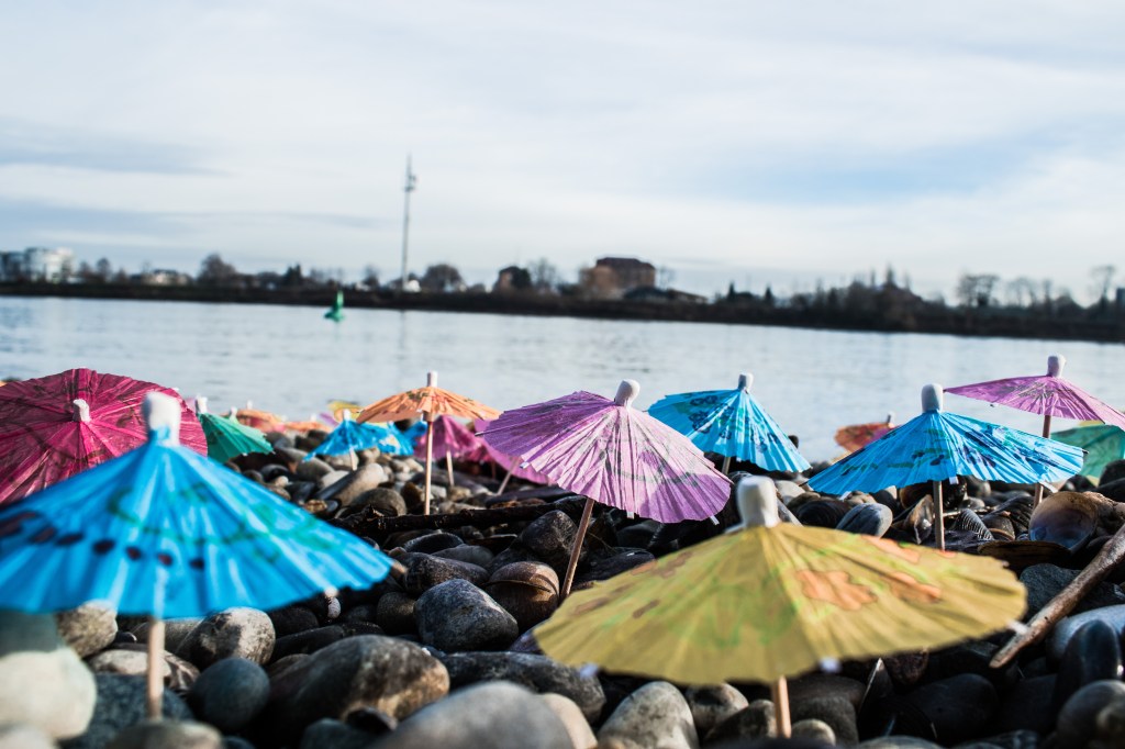 Nous y voici. De l’autre côté du tunnel, il y a un panneau indiquant le chemin le long du Rhin, en direction d’une plage présumée. Les gens prennent une carte postale. Une seule révèle le premier indice. La barrière est soulevée, le drapeau vert levé : les touristes peuvent commencer leur chasse au trésor. Arrivé au point de passage, un message invite à utiliser l’échelle pour descendre à la plage. Il y a une centaine de parapluies, et sous l’un d’eux, le deuxième indice. Il conduit à une canne à pêche. Un message dans une bouteille, accroché à la fin de la ligne de pêche, invitant à donner un code au vendeur de glaces. La bonne glace inclut un autre message : il y a un rocher qui peut fournir la clé du trésor. Une fois qu’il est trouvé, une équation permet de connaître le nombre de pas et la direction à suivre pour trouver le coffre-fort tant convoité. Quelques autres éléments récupérés sur les lieux comme une chaise, des jumelles, un bateau en papier, une serviette, et deux transats complètent la scénographie, racontant des histoires fictives et populaires qui se produisent dans un même espace. Enfin, le chasseur le plus rapide trouve le trésor : l’épée du pirate et une vue générale de la plage et de ses significations. Un espace qui, au départ, n’avait pas d’usage établi et offre la possibilité d’y revenir un autre jour pour rêver, pêcher, se baigner, jouer… Et le faire revivre !