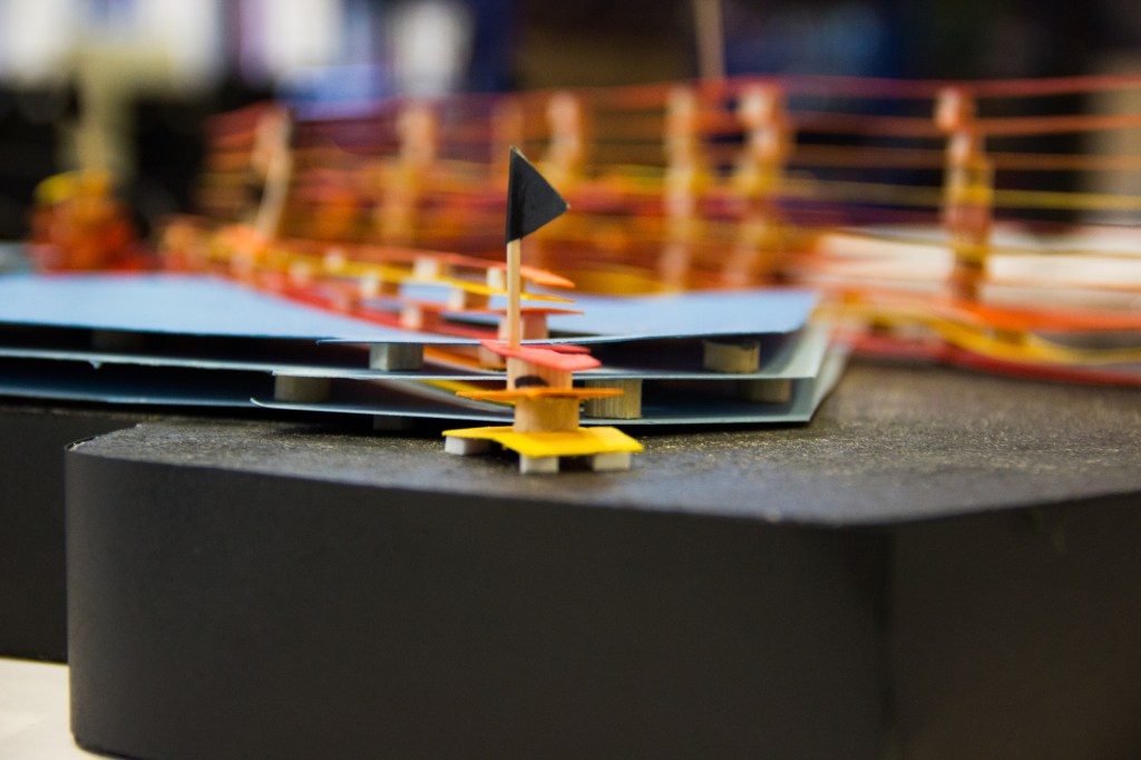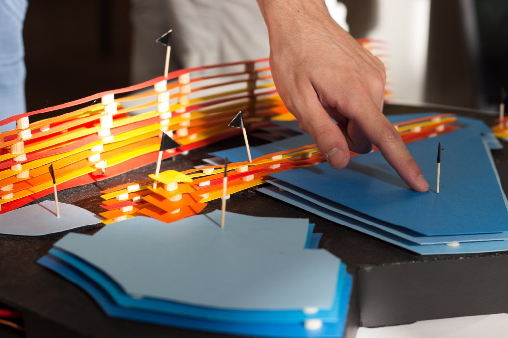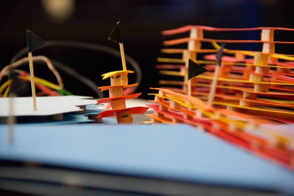 Les couleurs et la hauteur décrivent de manière graphique la puissance sonore en différents points du quartier. L’utilisateur active le son au toucher de la strate.