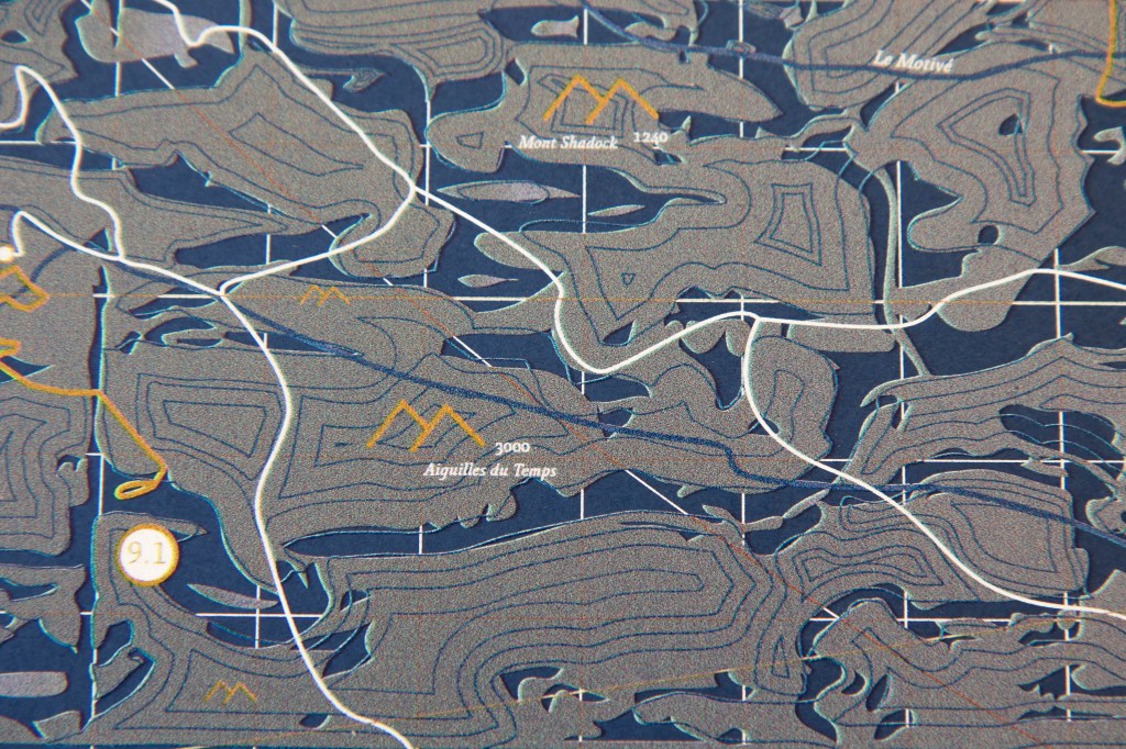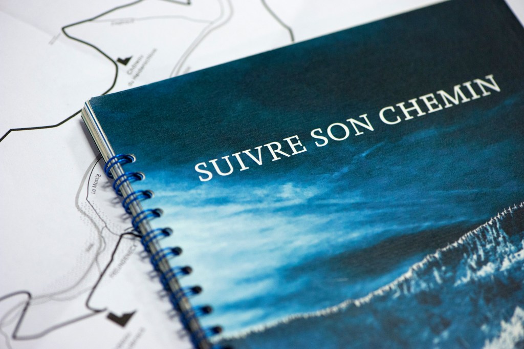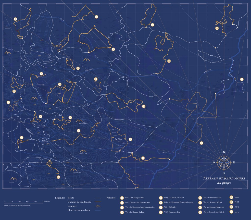Cette carte imaginaire présente l’ensemble des chemins de randonnée parcourus pour réaliser l’ensemble des carnets photographiques/carnets de recherches ayant servi de support lors de la soutenance de mon diplôme.
