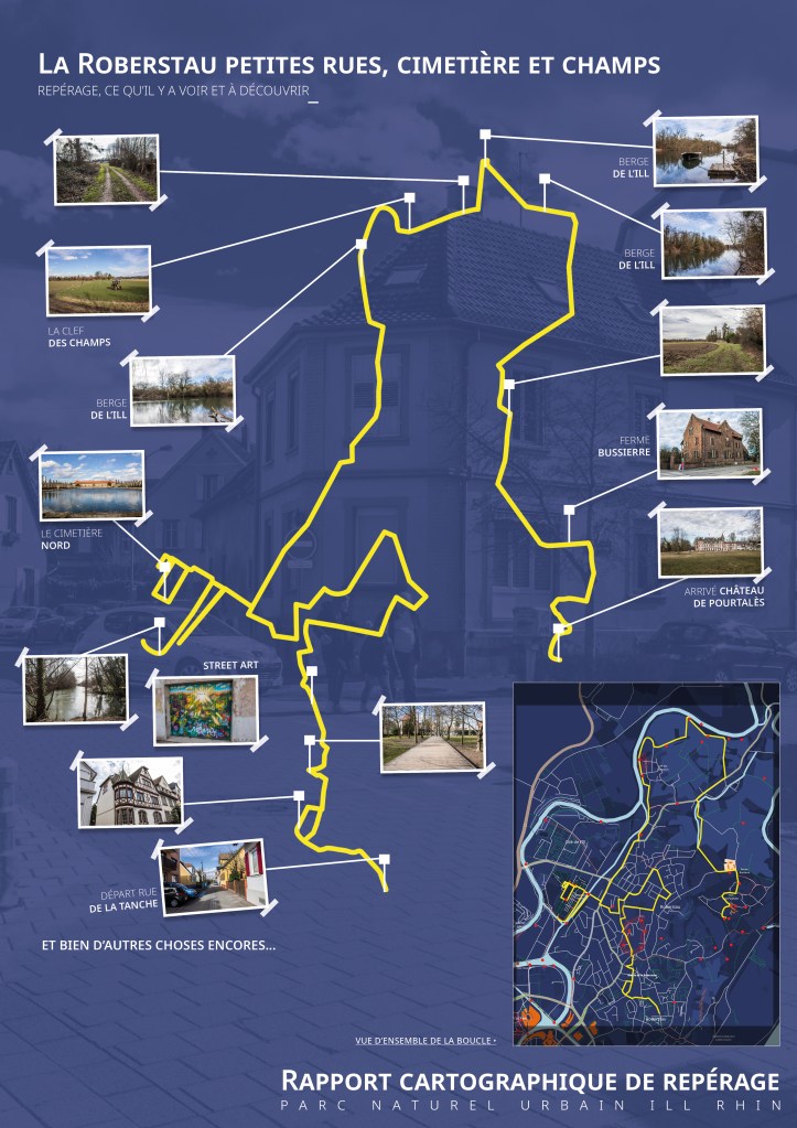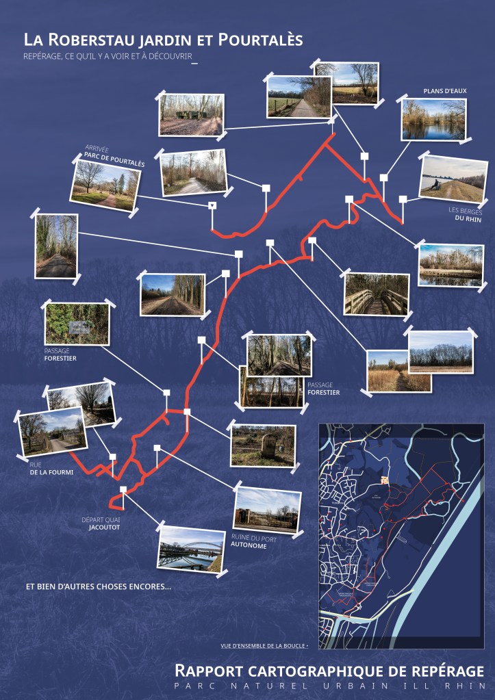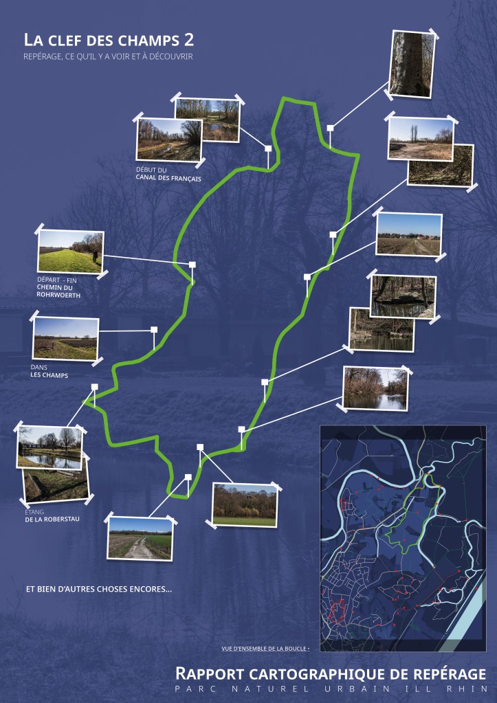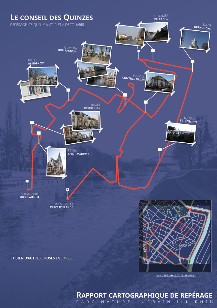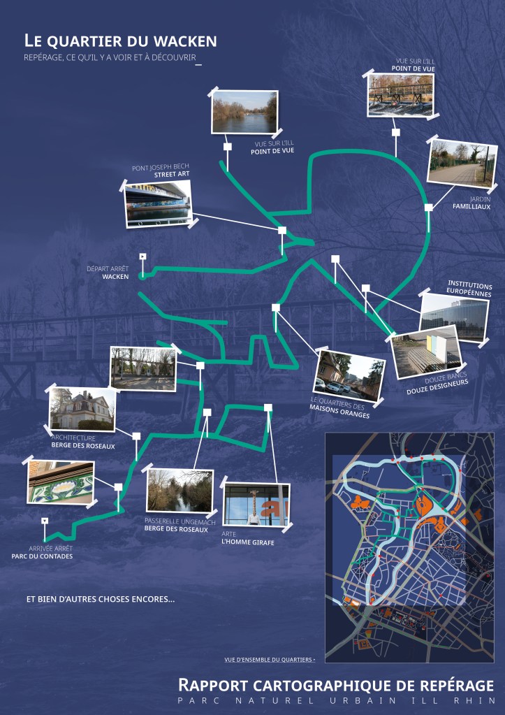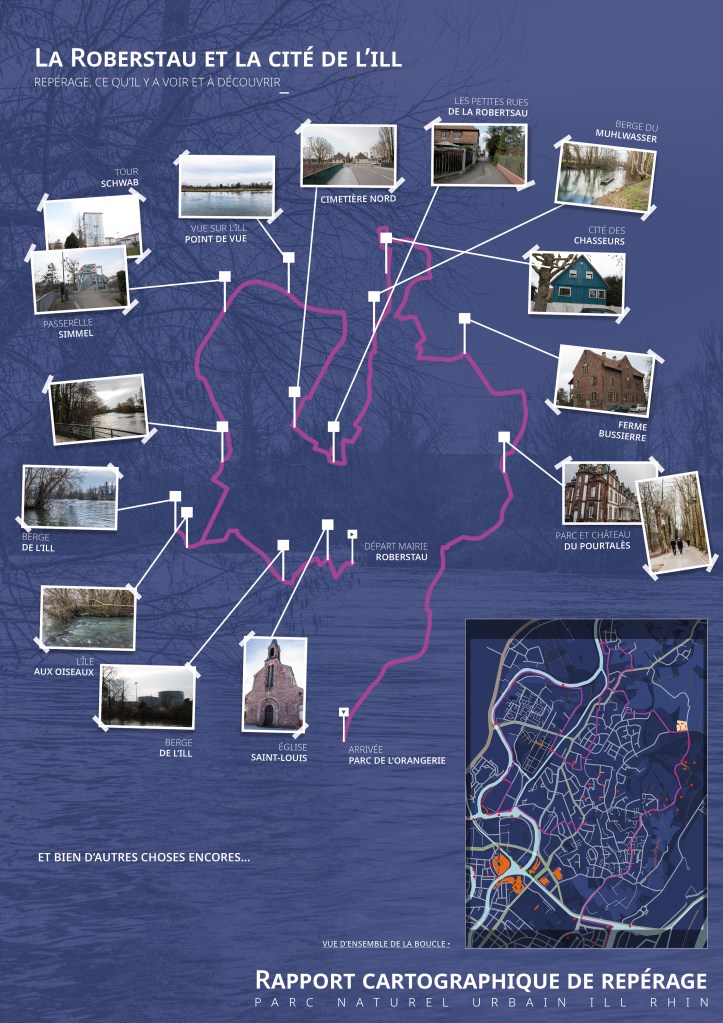 Chaque sortie sur le terrain faisait l’objet d’un travail de retranscription cartographique : à partir de mes notes, observations et ressentis, je réalisais des cartes, que je transformais ensuite en affiches pédagogiques et exploratoires. Les photographies prises lors des explorations étaient quant à elles intégrées dans la base de données du service de géographie de l’Eurométropole via le logiciel QGIS.
