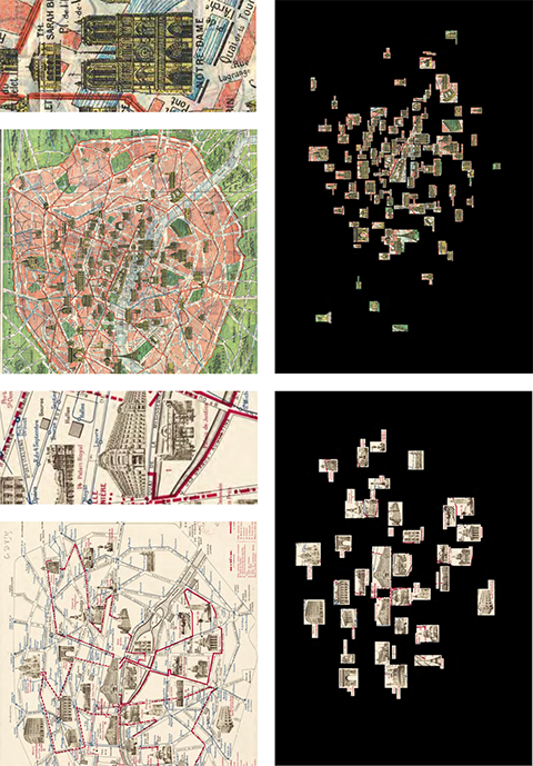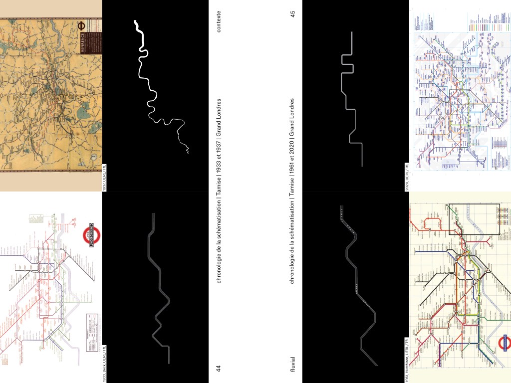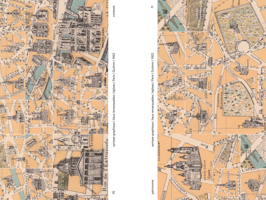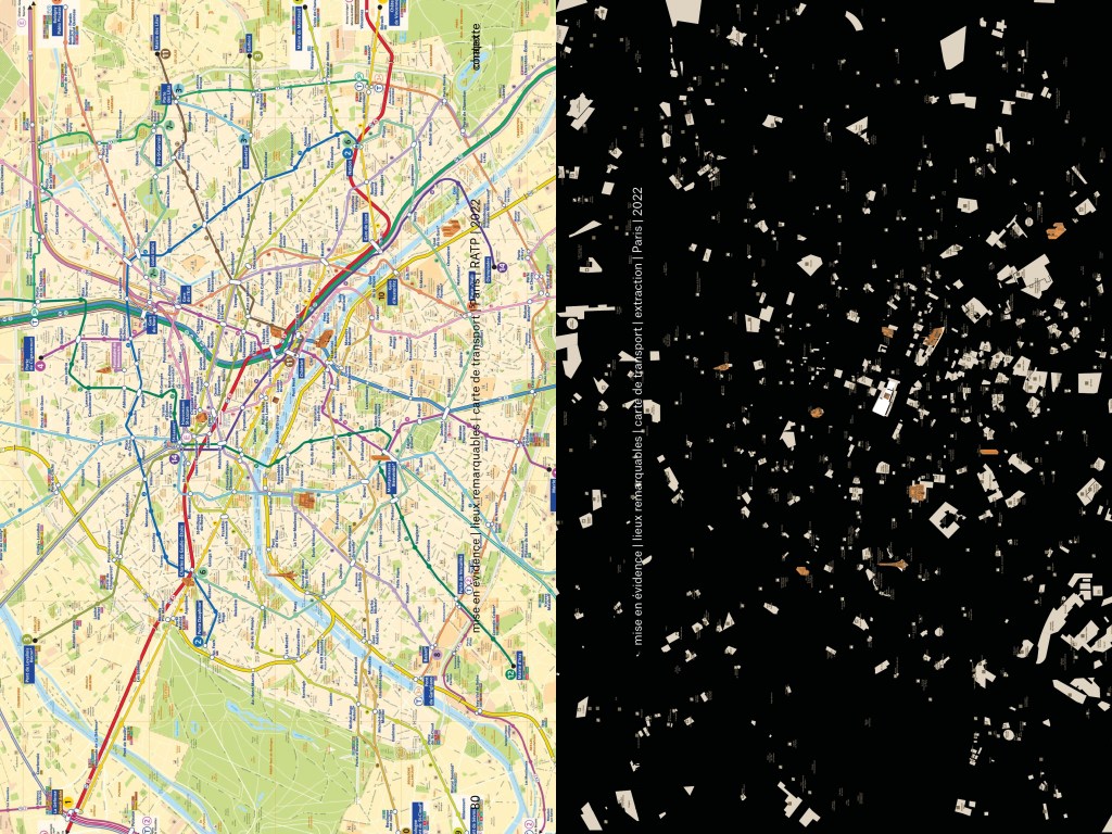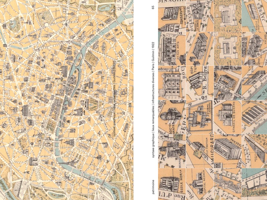 la pratique du design est orienté et ce en nous appuyant sur différent type de matériel cartographique, vues satellites, cartes de transports, historiques et contemporaines, en les manipulant en les comparant, en les superposant en les découpant, en extrayant légendes, pictogrammes et autres détails graphiques…